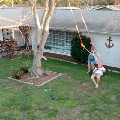 A tree branch falls on top of a man in the yard when he jumps with a rope attached between him and the tree to make it break.