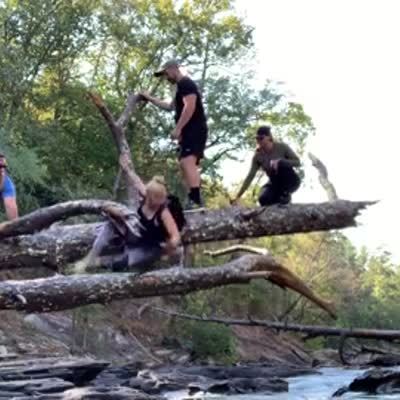 Two men and two women pose on a large tree trunk over a river and a branch breaks and one woman falls in.