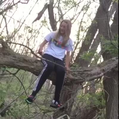 A teen girl climbs a tree outdoors and hangs from one of the branches. Her older sister walks behind her as the climbing girl says "It's gonna break" and asks her sister "You gonna catch me?" before the branch breaks and she screams as she falls to the ground.