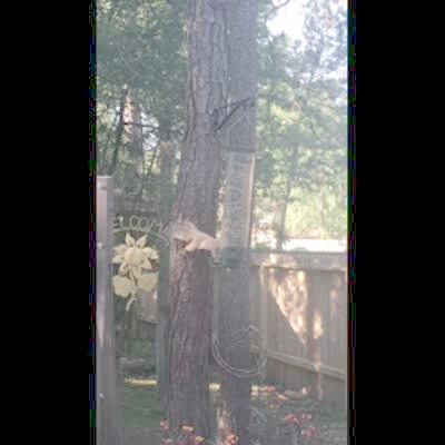 A squirrel climbs onto a bird feeder in the yard and the bird feeder spins in circles to throw the squirrel off. The squirrel holds on, but eventually, the squirrel falls off.