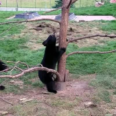 A bear cub is stuck on a tree branch at a zoo and jumps to climb a tree, but can't.
