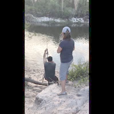 A grandmother stands on a tree branch and holds onto a rope swing and tries to swing into a lake but gets dragged across the ground and lands on her face in the water.
