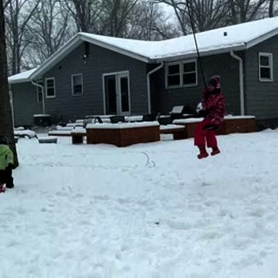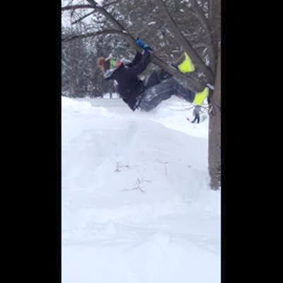 A teen girl climbs a tree in the yard and slips and falls into a deep pile of winter snow and disappears into it.