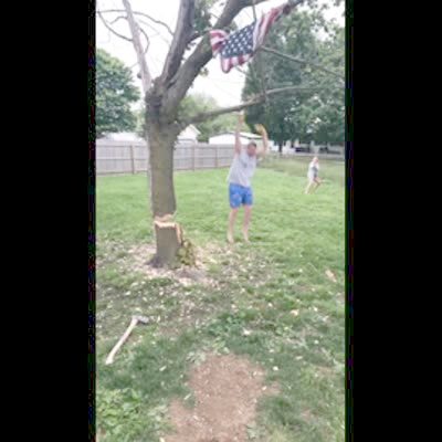 A branch falls on a man trimming a tree and he's knocked off his ladder and falls to the ground. A short while later an even larger section of the tree falls om him. His family runs out into the yard to help him by lifitng the tree limb off of him. Security footage.