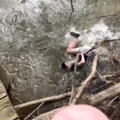 A man stands on a tree branch hanging over a river. He plans attempt to jump from the branch to a bridge next to the tree. Before he can jump the branch breaks and he falls into the water below. The men and young boys with him laugh at him.