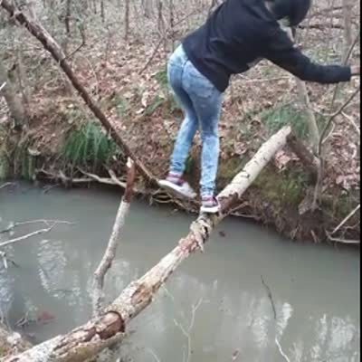 A teen girl walks around a branch across a small stream. The tree branch cracks and the girl falls into the water.