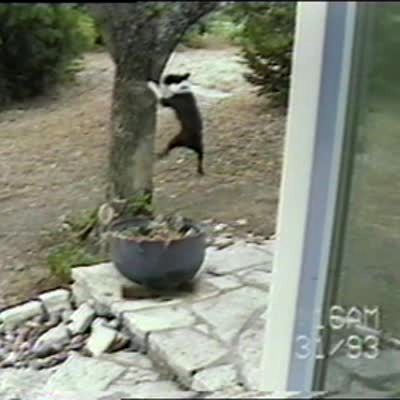 A woman films a squirrel that sits on a fence in a yard, then she gasps and ducks down when it jumps at her.