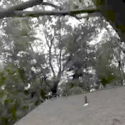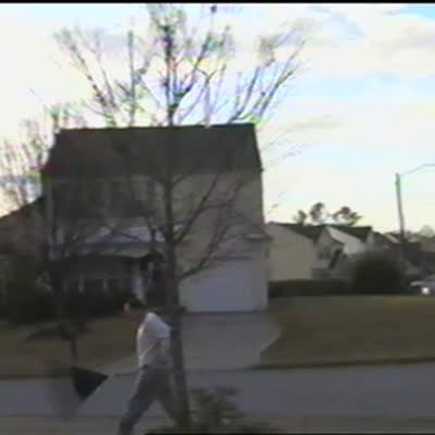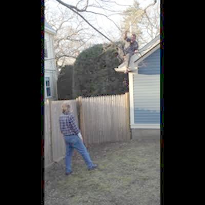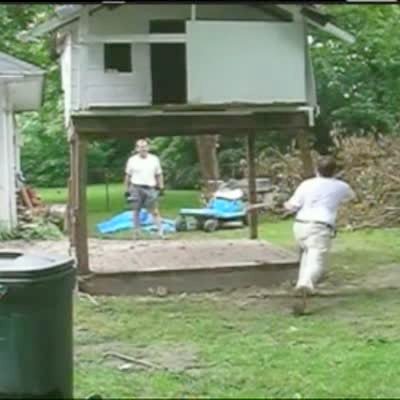 People cut down tree with chain saw. Tree falls & knocks entire corner of trailer / house down. Shaky camera. Boneheads.