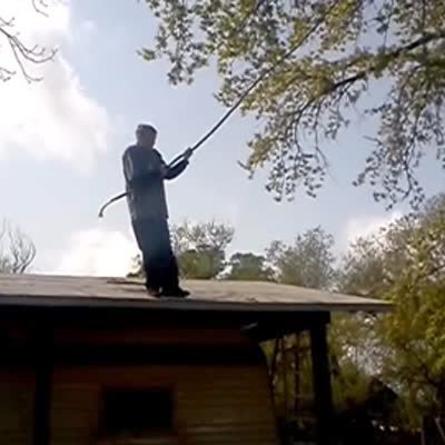 Man throws a rake at a tree trying to get toilet paper out of the branches. The rake gets stuck in the tree & has to throw another stick up to get it down. Bonehead.