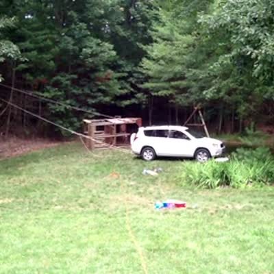 A family ties their newly built jungle gym/tree house to a car to pull it and stand it up on it's base, but it tips over to the other side and collapses when it hits the ground.