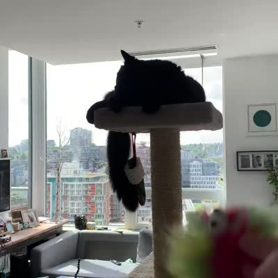 A woman throws a toy for a cat in a living room, but it lands on the floor, then she throws it again, and it lands on his head.