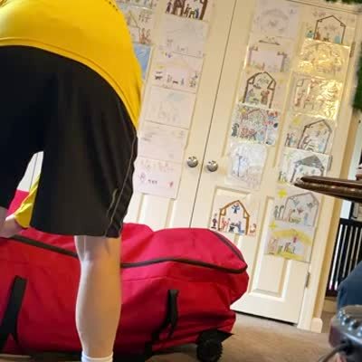 A man opens the bag for a Christmas tree in the house, and a woman hides inside to scare him. The man screams when he sees the woman and falls over.