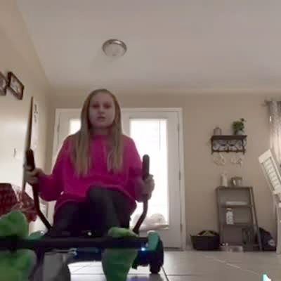 A girl demonstrates how to use a hover board with the driving attachment in the house. She falls backwards and rolls into the backdoor. The hover board then rolls away by itself and crashes into a Christmas tree off camera. An ornament rolls across the floor. A woman yells at her. TikTok