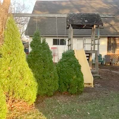 A young girl cries in the backyard when her father cuts down a tree and it destroys a tree house when it lands on top of it.