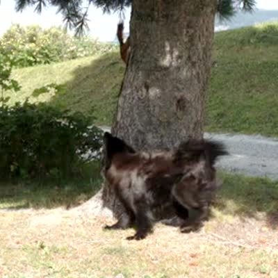 Black dog barks and chases squirrel in circles around tree, squirrel climbs sideways on tree trunk.