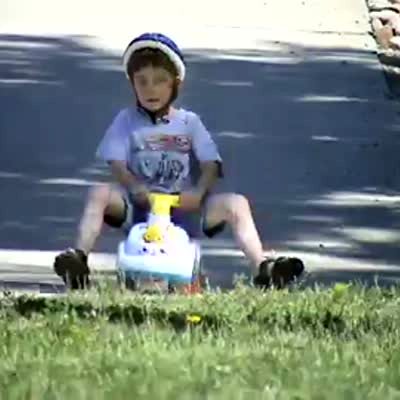 Young boy rides big tricycle, hits a mailbox hard. No recovery. Boy makes great face when he knows he's crashing. Bike, bicycle. good reaction.