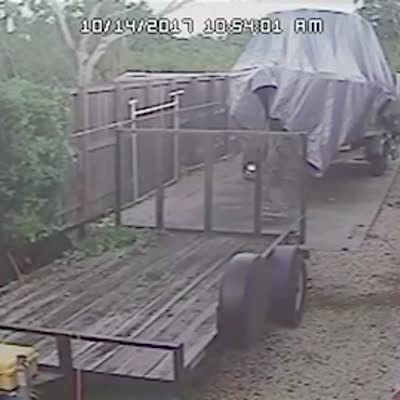 Security camera footage of a man who stands on a trailer in the yard and leans off the edge to trim a bush, but he loses balance and falls into the bush. No audio