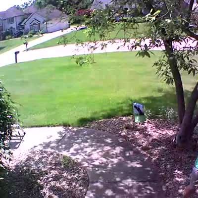 A man is using a tree trimmer when a blue jay flies out from the tree and startles him. When he turns to move away, he stumbles and falls down in the yard. Security footage.