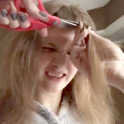 A young girl's sister cuts her bangs completely crooked in the house.