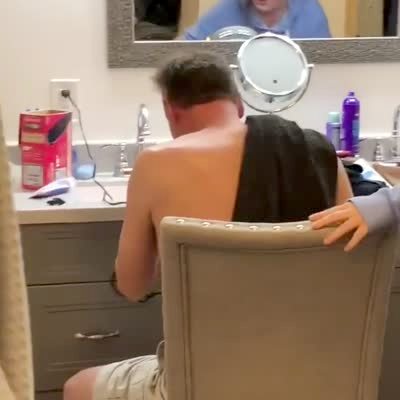 A man cuts his own hair in quarantine, and struggles to fix it as his wife and teen daughter laugh at him in the house.