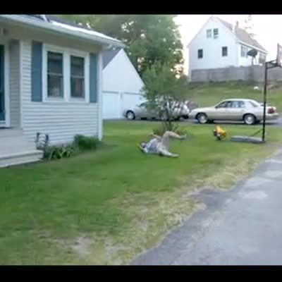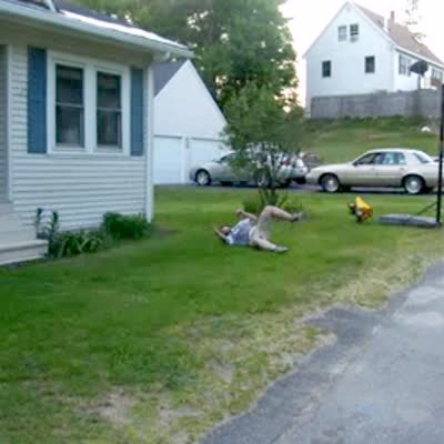 Teen girl rides homemade zip line in the backyard, her sister tries to stop her from hitting a tree but she's knocked over & zipliner girl hits a tree trunk.