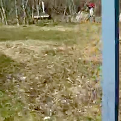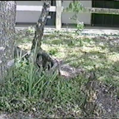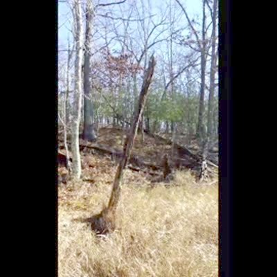 Small dog hides in a tree trunk & waits for a big dog to come by, then jumps out of the hole & barks at big dog. )