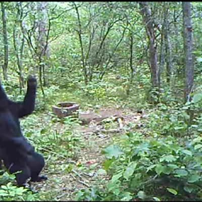 Two people try to free a black bear from their car. After several attempts, and one of them falling down, they're finally successful in opening the liftgate, allowing the bear to escape and run off into the woods.