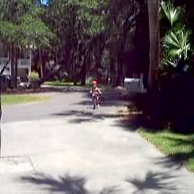 Tot boy in a helmet rides his bike without training wheels and crashes into a palm tree. Grandma just told him what a great job he was doing.