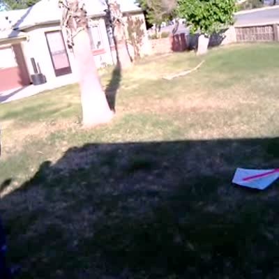 Little boy runs across yard holding kite, runs right into tree trunk.