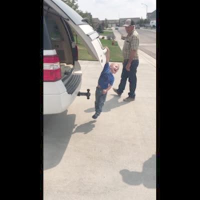 A young boy opens the trunk of an SUV in a driveway, when he gets lifted from the ground and taken up with it. As he dangles from the back, his grandma comes and helps him down. Security footage.