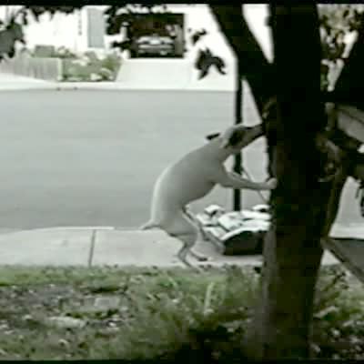 Man says "squirrel" prompting his tan dog to run up a very big tree in the backyard. Dog runs up the trunk very quickly and easily. Amazing, unusual. Pet trick