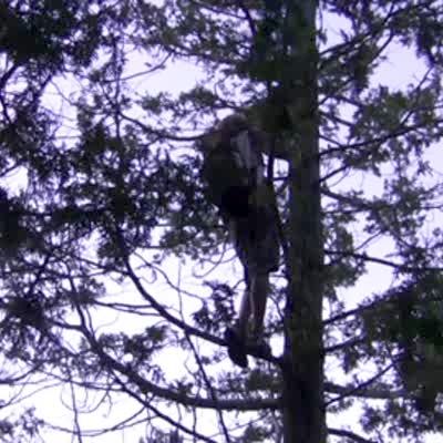 A woman climbs a tree but grabs a dead branch and falls to the ground.