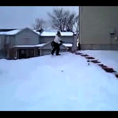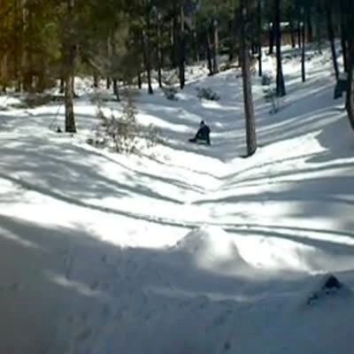 Woman rides a sled down the hill and crashes into a tree. She hits her head and crotch / groin. Snow.
