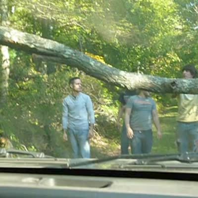 Two men try to move a large pine tree when one of them gets pinned under the trunk..