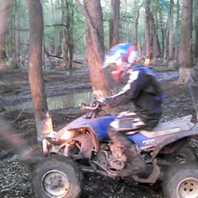 A young man rides an All terrain vehicle in a forest and runs into a dead tree that snaps and falls directly on the man's head/helmet.