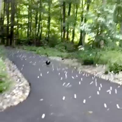 A woman opens an SUV trunk and thousands of golf-balls pour out and bounce and roll down the driveway.
