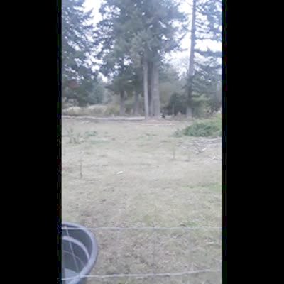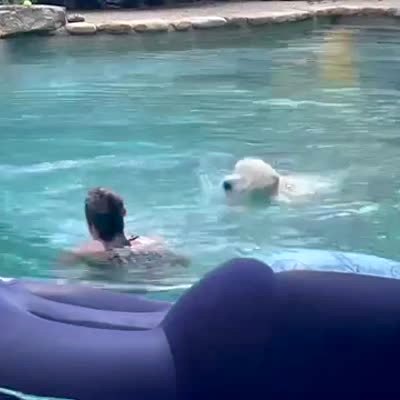 A duck floats in the pool and a woman approaches it and the duck attacks her and she falls and runs away in the backyard. Security footage.