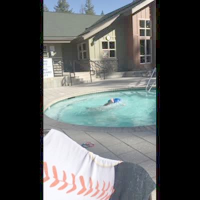 A man tries to get into a hot tub but loses his balance and falls onto his father-in-law's face while he sits in the water. Security footage.