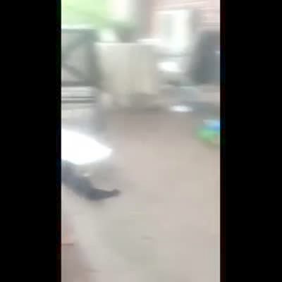 A woman runs out into a yard in the rain and she runs back and slips and falls on the porch. Security footage.