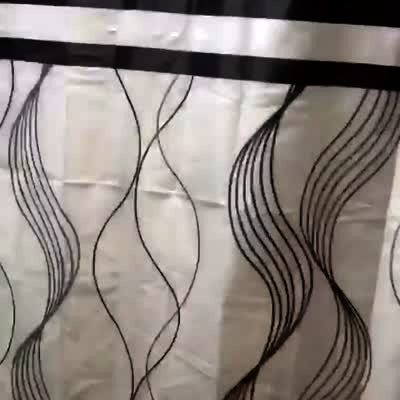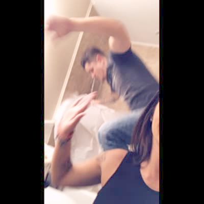 A woman dances in the bathroom while a man works behind her and leans on the curtain rod which breaks and he falls down into the tub.