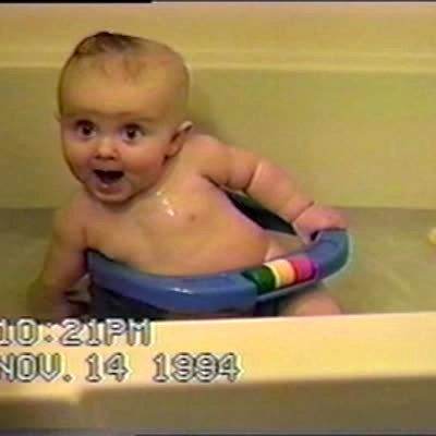 Baby in bath tub farts, creating a small bubble from its butt. Bathroom.