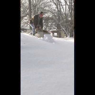 A man pushes his young son in a plastic tub over snow. The boy immediately falls in the snow and the tub flips to hit the boy in the back.