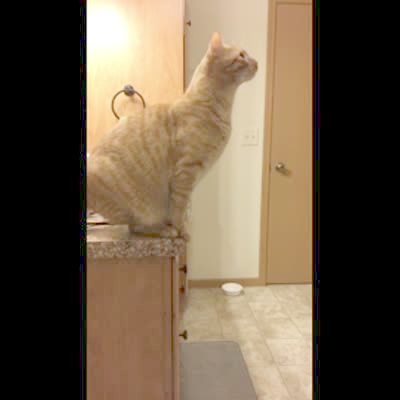 The woman with the camera explains that every morning she gets her shower ready in the bathroom and then moves the curtain to show her cat in the tub. The cat stands on its back legs and licks the water.
