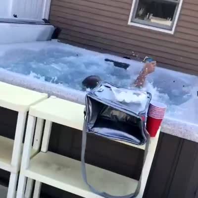 A man does the bottle-bounce challenge in the backyard., and the beer bounces into the hot tub. He jumps in after it and drinks it, then says "tastes great".