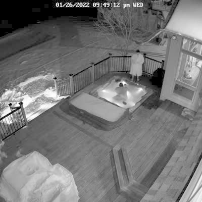 A man gets out of a hot tub but slips on a slippery, icy patio deck. He falls backwards back into the hot tub. Night. Security footage. Inappropriate language.