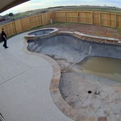 A man trips and falls head first into an empty hot tub in a yard. Security footage.