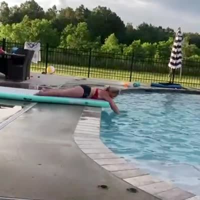 A woman tries to run and slide on a slip-and-slide into a pool but she falls flat and bounces and does not slide and slowly wriggles into the pool in the backyard.