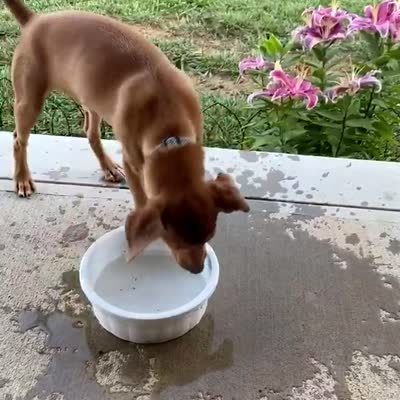 A dog paws at a water bowl and splashes it all over a patio and then falls off the patio.