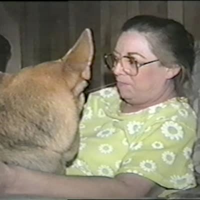 Teen girl & Scottie dog play tug of war with a towel inside house. The dog suddenly grabs girl's ponytail & pulls.