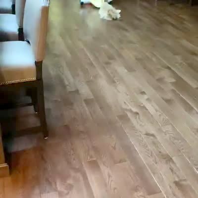 A Spaniel puppy dog pulls his own bed over himself and then runs around the living room with it on top of him.